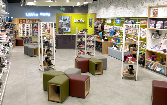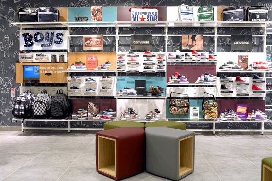 The concept is simple, engaging (especially if you’re a small person) and utterly accessible. An invigorating colour palette and quirky hand drawings that will appeal to kids the world over have been applied throughout the store. The double height, glass front complete with doodles is simply stunning. Whilst internally, differing styles and heights of wall units mix casually with a variety of freestanding display fixtures and fittings and are kept purposely low to aid the younger shopper. Divided into three key sections, boys, girls and ‘little ones’; each area has a distinct appearance to help direct the correct customers to the relevant shoes. The boys are on the left. A practical, fully adaptable white wall unit displays shoes and bags on a range of small individual and large glass shelves and hooks. The unit is set against a striking graffiti wall – white hand drawn monsters, cars, skulls and amphibians are sketched onto grey graph paper - to designate the boys’ zone. The girls, on the right, have a similarly eye catching background that has also clearly taken its inspiration from the school exercise book. Hearts, swirls, twirls and all things girly are doodled in white on a more fresh and feminine green wall. They create the perfect backdrop for the slightly more sophisticated perimeter ‘wardrobe style’ showcase that displays product in the girls’ zone. Finally, on the back wall, Little Ones is emblazoned in blue neon and items are displayed on individual shelves within a wood edged perimeter cabinet similar to the girls’. Further white, hand drawn pictures are set off against black on a striking panel at the bottom of the unit. Shopfittings and display equipment play a key role in creating the relaxed ambience where customers feel totally at ease and the quirkiness is part and parcel of the design. The counter, located at the back of the store, is as a much a feature of this concept as the three sales areas above. It has a textured green wall, smart stainless steel top, shiny black front and its very own chalk blackboard to complete the look. Finally, individual seats shaped as arrowheads, that allow for storing empty boxes whilst kids are trying on the shoes, can be grouped together to form banks of seating. There are very few stores dedicated to children’s shoes and this store with its young, inquisitive approach should prove popular with kids and parents alike!