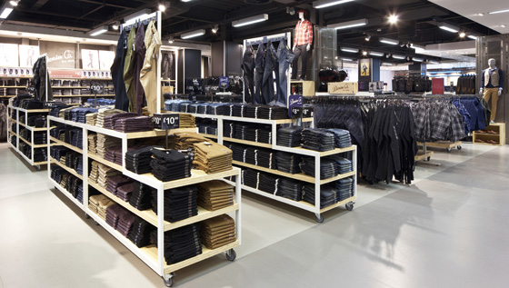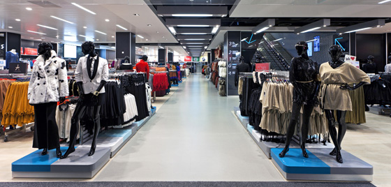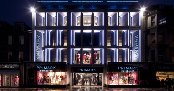 Another store, another capital! Dalziel and Pow has worked its magic for value brand leader Primark once again to great acclaim. Primark’s debut on Edinburgh’s Princes Street is impressive to say the least. Its intentions are clear – the store is big, brash and brave. Primark has stamped its mark on the Scottish market. This five floor 75,000 sq ft flagship has taken virtually two years to complete. The previous structure was demolished and a new store built (one that looks incredible by night and enormous by day). I’m not entirely sure that I can see “the reference and sympathy for the surrounding heritage”, as the designers put it, but it does reflect the fashionability and success of this cut price retailer with absolute accuracy. On entering the store the different levels, up and down, can be glimpsed and help you to navigate this unconventional outlet. The interior architecture itself responds to the challenging footprint that the store provides and works to support the customer journey. New and contemporary finishes have been applied to the varying ceilings and angles that feature here, to bring diversity to the brand and enhance the store’s inherent characteristics. The atrium, as in all Primark stores, is a feature and embodies the brand’s outlook, and Edinburgh has two! The main escalators are at the Princes Street entrance and use digital screens to interact with customers and reinforce the core brand values. At the top LED lighting rings in brand colours are suspended from the ceiling, complementing the soft curves of the wall graphics. Colour, light and form combine creating a space unique to Primark as you move between floors. A second atrium features at the Rose Street entrance, which is on a different level. Here a vast, glass staircase appears to float in space and attempts to connect the various departments and help ease the complicated customer journey. Menswear is of particular interest. Sited below ground it has been given special treatment to both highlight and detract from the windowless space. Natural wood has been applied to the regular fixtures and fittings. The wall behind the usual long bank of tills has been covered in fake brick. Mesh combined with wooden crates, cages and shelving units are used as visual merchandising displays. These new features help break up the monotony of this large store, as well as ironically, giving it a far more independent feel. The four floors above follow the normal Primark format with well ordered and versatile shopfittings and fixtures. Another evolution for Primark!