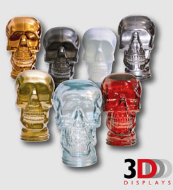 3D Displays are excited to announce the arrival of a stunning addition to their range. The glass head is one of our most successful products and is now complemented by a range of stylish skulls, clear and coloured.