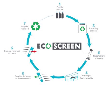 The newly-launched Eco-Screen is Leach’s latest HD fabric graphic product, made from textiles composed of 100% recycled yarn. It can be used for all back-lit displays with no reduction in photographic or illumination quality and when the graphic needs updating, the fabric can be returned to Leach for onward recycling. This ‘return to base’ model means the solution is completely circular, with two recycled plastic bottles required to produce 1m² of Eco-Screen. 2.29 tons of CO2 are also saved for every ton of plastic bottles salvaged.