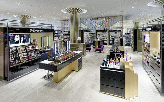As you enter on ground level you are immediately drawn to the enormous circular columns that follow the curve of the building and are fashioned as huge, gilt palm trees. These enormous eye catching pillars allow your eye to roam freely around the premium beauty and accessories department. The feature columns continue throughout the store. From simple, smooth white pillars in mens and womens formalwear that complements these pared down departments, to funky, mirrored columns where strip lighting branches out on the ceiling to create the palm fronds for mens and ladies fashion.
