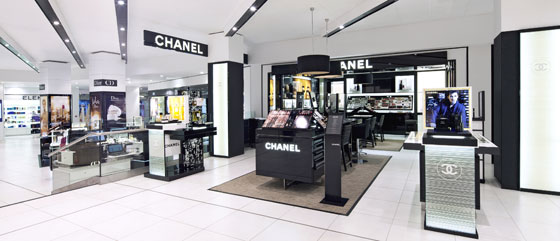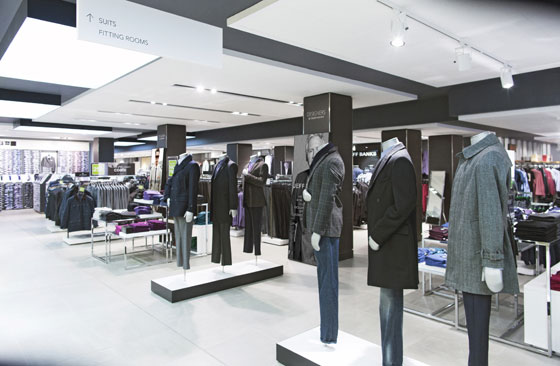 50% of Debenhams fashion business is exclusive with the majority of that offer branded as ‘Designers at Debenhams’ and this new concept creates a suitably fitting environment. Designers are given more prominence, their ranges highlighted and space is dedicated for directional and curated range showcases. Throughout the store display cabinetry and counters are monochrome; in menswear white plinths edged with black have display mannequins mounted on top. These are interspersed with aluminium framed display tables that feature white lacquered tops for folded stock. Black pillars edged with chrome complete the look. Womenswear is similar but the pillars are mirrored for a more glamorous touch. Footwear follows suit and mens footwear has a slightly more robust quality with sleek wooden display tables with white lacquered tops, plus dark, metal framed freestanding display units with wooden shelves. The new beauty hall, also in monochrome has become its biggest and best to date.