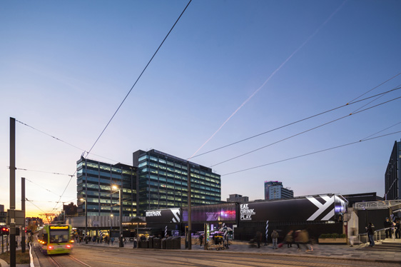 A few miles south of London lies Croydon, the new location for the second Boxpark. The first opened in Shoreditch in 2011 and was so successful that it has remained well beyond its three year lease and its creators sought a second suitable site. Croydon is hyper connected to all areas of the South East and beyond, you can be in the heart of London in just 14 minutes, or on the coast in less than 40 minutes. This new Boxpark is phenomenal; the structure is twice the size of Shoreditch constructed from 96 stripped and refitted shipping containers that form a courtyard. This has been covered to provide a year round music and entertainment venue. BDP worked with Boxpark to develop the container structure and then Brinkworth developed the other elements of the public sections. A black steel framework and timber scaffolding boards form a range of seating areas, platforms and planters that create an open and sociable space to mingle around the retail units.