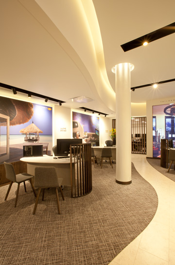 Design agency, LustedGreen developed an exceptional concept for its two Kensington High Street stores – the Travel Centre and the Premium Travel and Cruise branch. Starting with the Travel Centre, the open plan layout is based on big, bold and colourful imagery to convey the excitement and anticipation of travel. There are digital screens to promote the various destinations on offer and a curved path to lead you around the store and add a sense of adventure. As an avid traveller myself – well, who doesn’t like an exotic holiday or two - I love the new format. The large graphics take in exotic animals, idyllic beaches, iconic natural wonders and an enormous map of the world – such a simple and effective solution. The entire store is bright, open and welcoming. There is nothing in the window to obscure your view of the interior and its seductive glossy images. Washed oak brings muted warmth to the uncluttered interior and is used as a theme throughout the space. The numerous, individual sales desks, rather than being in straight lines, follow the curved path. Desks are curved themselves and partially screened to provide a degree of personalisation – which this tour operator prides itself on. It really is a revelation in travel retail. Across the road from this store, a more exclusive feel has been applied for the Premium Travel and Cruise offer. Using a very similar format and arrangement as the Travel Centre, the interior of this luxury holiday agency is enhanced with a richer palette of dark-stained ash, neutral stone and grey tones. A deliberately warmer and more focused lighting scheme combines concealed LED lights washing over surfaces with pools of spotlighting. The new store also provides a hospitality bar for serving tea and coffee to clients. As in the previous store the individual rounded desks are partially screened and trace the line of a curved path. Large format graphics depicting sensational places fill one side of the branch, whilst multiple 55 inch LCD screens that showcase the premium offer are mounted and line the opposite wall. At the rear of the store an administration area is screened off with full height timber slatted screens, and separated by a large back-lit graphic of a hotel.