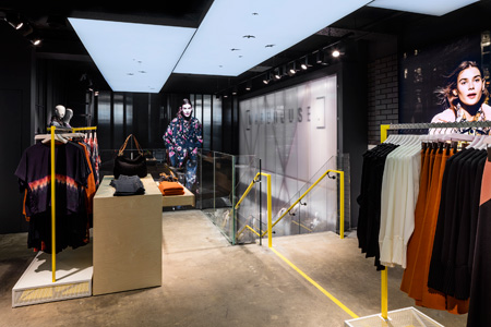 Warehouse is back with a vengeance. The store may be small at 251 square metres but it sure has attitude – as do the clothes themselves. This is an entirely new look for the retailer and it is entirely cool. From the outside the window display mannequins set the scene, overhead light boxes bring drama into the moody interior and a large digital screen can be glimpsed at the back of the store - its moving imagery draws you in.