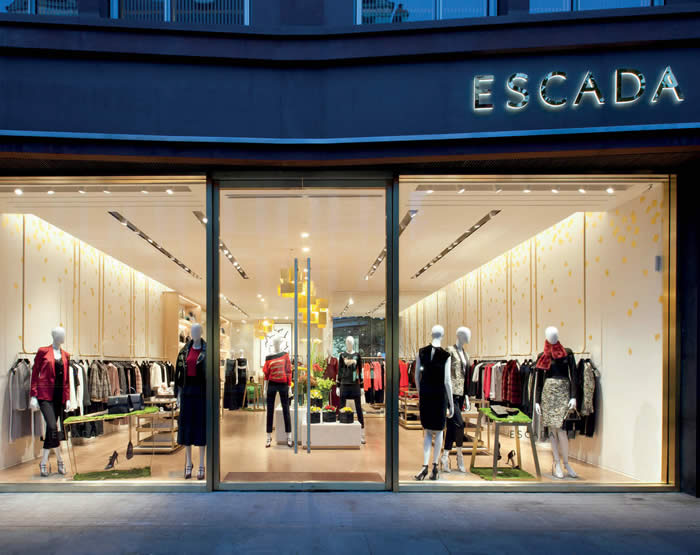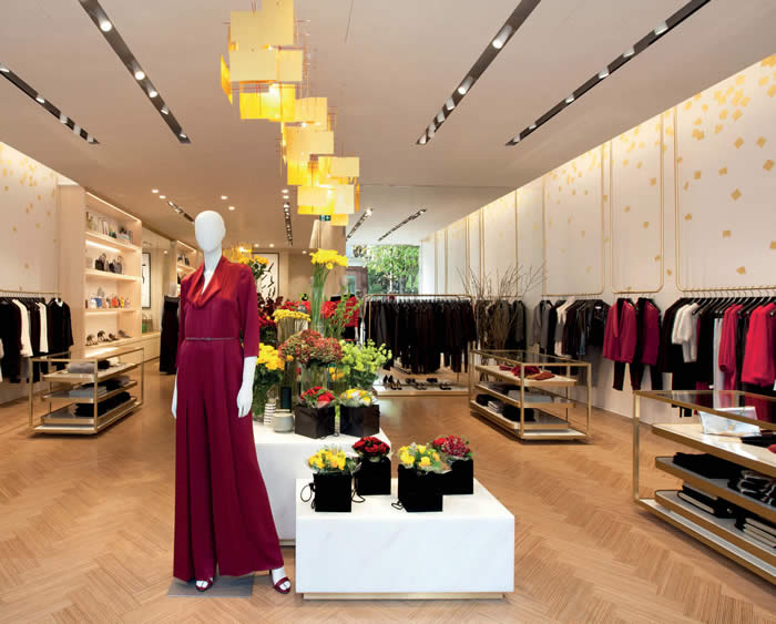 is a clean and uncluttered environment. Everything is on a grand scale adding to the sumptuous feel; from the store’s gargantuan height to the shopfittings, mirrors and shelving which all extend from floor to ceiling. Gold, tubular fixtures rise up to the ceiling from the hanging rails and shelving below. Towards the back of the store an oversized, wardrobe style, floor to ceiling shelving unit displays handbags, shoes and accessories and creates a dramatic backdrop.
