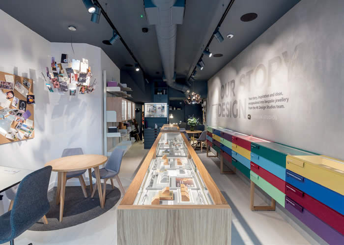 The bank of drawers, in their bright hues, leap out at you compelling you to take a peek, whilst the wording above informs your purchasing decisions. On the opposite side of the store, more functional styled, grey shelving is used to store workbooks and other literature. Above the shelving another three wall mounted showcases feature further items of unique jewellery. Other than a glow of light within the display cabinets to enhance the one off pieces, the lighting is fairly subdued allowing the brand’s message maximum prominence. Even though the designers are visibly hard at work the studio retains a calm, intimate atmosphere. This new store is a wonderful example of how retail and design combines to create an innovative and exciting experience store. Lumsden Design has struck the perfect balance for this novel brand.