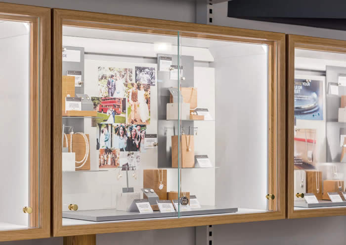 The exterior sets the scene; a blank canvas is achieved in this instance with a dark, inky grey shopfront that frames the door and windows allowing your eye to glide across the inside. A simple logo is all that sits above the window. Inside, near the front, a small work station is set to one side and a designer is on hand to offer assistance to would-be customers – a small table is dressed with an ultra modern, eccentric chandelier that infuses personality and charm. A long, low glass display case edged with light oak runs the entire length of the space and is positioned in the centre. The majority of the ‘off the