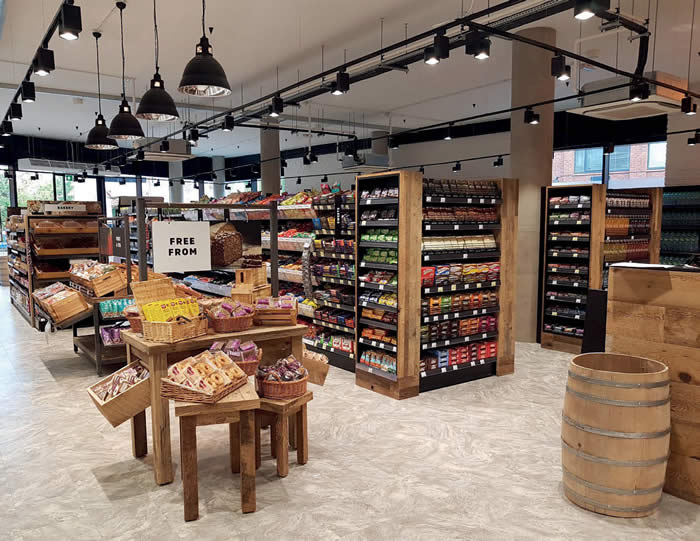 The double height ceiling which is left open to reveal exposed vents and beams, has suspended spotlight trunking that also increases the feel of this very cool interior. A row of large, pendant lights that are hung between the fridge and the bank of central display units delivers yet another stunning focal point. RDS provided a project management service to the University, overseeing the tender, shop fit out and retail fit out during the summer break to ensure it was operational in time for Freshers’ Week in September. This exciting store would look suitably at home on any high street – Royal Holloway Student Union sets an excellent benchmark for grocery traders. . .