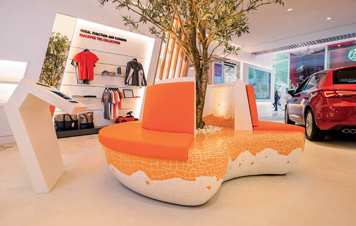 With much inspiration derived from its Spanish heritage, SEAT elevates the everyday car to art status. The walls are brilliant white, ergonomically shaped and moulded all around. It has a highly minimal feel with just three cars on display and very little in the way of point of sale or signage to detract from the product. The pared back interior allows the cars to shine, however quirky references to its Mediterranean roots are present throughout. The flooring changes as you move through the store from mosaic, to cobbles, to stone. A full size olive tree offers a respite from the stark brilliance of the space and is equipped with orange, mosaic seating where you can ponder before committing to a very expensive purchase. The tree adds an element of nature and the vibrant mosaic brings an element of the warmth and depth of colour associated with Spain.