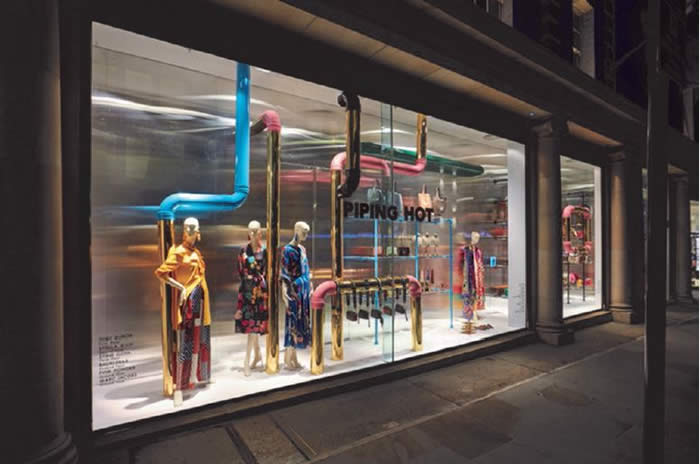 Propability worked alongside the Fenwick of Bond Street Visual Merchandising team to create this impressive window display delivering an industrial yet sophisticated merchandise display. Themed ‘Piping Hot’ the concept was brought to life by Propability – designing scaffolding style shelving which was sprayed in various colours. Instead of using scaffolding planks bespoke clear acrylic shelves were created to create a lighter element to the display on which to position key merchandise.