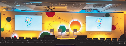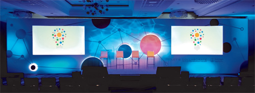Olson Visual used the T3 modular framework system to create an 18 metre long conference display wall with a few key features that needed to be included into the design for the actual project. The brief called for a large display wall to be situated on the stage and serve as a back drop for the numerous speakers that were to present at the event. The design included two projection screens and custom cut out circles.