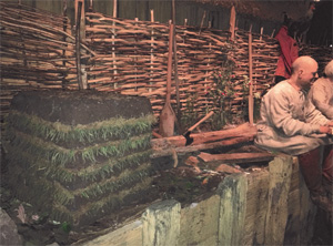 Although many of the buildings would have had thatched roofs, many would also have turves. So The Silk Forest built a turf-stack which sat beside the Viking characters who were supposed to be working on the buildings - the image clearly catches them during their tea break!