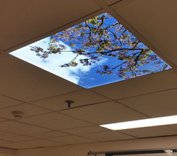 LumiTile edge lit LED display ceiling panels are now available from Artillus – Ways2display Ltd. These 595 x 595 ceiling tiles are only 10mm deep and have a slot in open edge to incorporate a changeable printed graphic. The LumiTile uses a cnc engraved grid patterned acrylic and 24v edge lit high bright LED for even lit and shadow free illumination. The LumiTile will drop into a standard 25mm suspended ceiling grid to create a surprisingly attractive talking point. Each Panel comes with a 24V DC transformer or up to four panels can be linked. The panels can be supplied complete with graphic print.