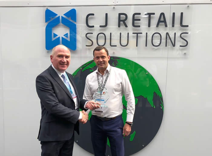 While at RDE, SDEA President Angus Morton (of B Brown Display Materials) awarded the best stand accolade to CJ Retail Solutions: