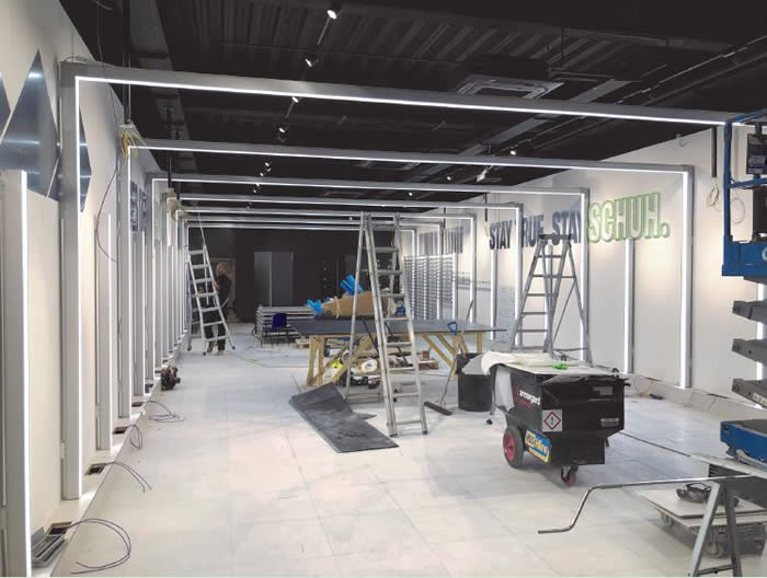 Once finalised, Unibox set about bringing the designs to life. The Livingston store, due to its proximity to schuh’s Head Office, was scheduled to be the first trial site, and delivery was required in a timescale that was tight even in retail terms. Unibox’s unique mix of manufacturing skillsets enabled profile fabrication, luminaire assembly and electrical testing to flow smoothly and effectively through their recently extended Manchester production facility. For just 1 of schuh's 132 stores, Unibox supplied over 120m of illuminated profile for the archways, along with nearly 1000m of RSB extrusion with bespoke brackets, all delivered on time and to budget.