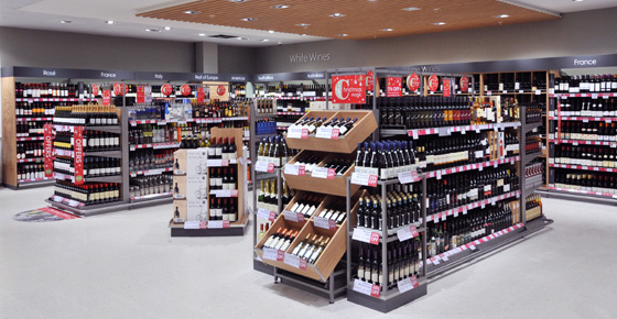 Instore, the layout is spacious, wide aisles invite browsing and signage using simple graphics and the customary Waitrose grey, is simple yet effective.  Shelving follows suit being mostly grey with the addition of wood shelves and white uprights within Homeware, wood shelving and crates in Wines and wood fronted counters with a black brick backing wall in the Delicatessen, to add a touch of class and help differentiate these areas.  Additional natural slatted wood inset with spotlights adds detail and finesse to the ceilings of the wines and fresh food counters.